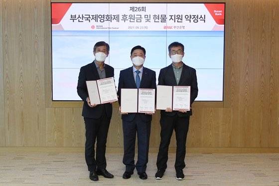 부산국제영화제 이용관 이사장과 허문영 집행위원장은 23일 오후 BNK부산은행 본점에서 제26회 부산국제영화제 후원금 및 현물 지원 약정을 체결했다.