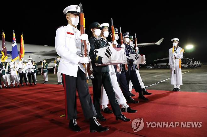 (성남=연합뉴스) 최재구 기자 = 23일 밤 서울공항에서 열린 국군 전사자 유해 봉환식에서 함께 문재인 대통령과 함께 귀국한 국군 전사자 유해가 하기되고 있다. 2021.9.23