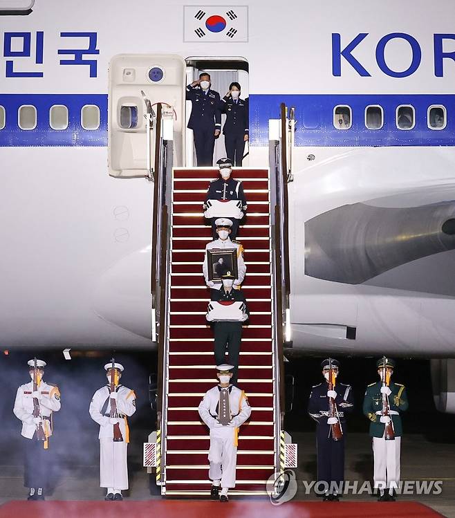 (성남=연합뉴스) 최재구 기자 = 23일 밤 서울공항에서 열린 국군 전사자 유해 봉환식에서 의장병들이 국군 전사자 유해를 운구하고 있다. 2021.9.23