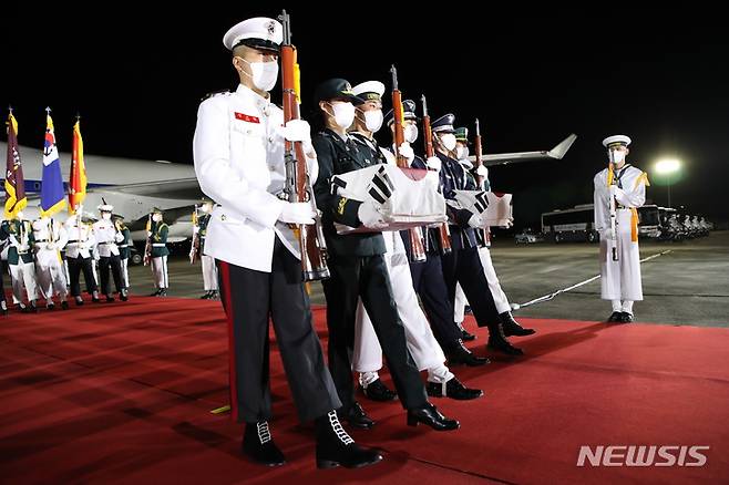 [성남=뉴시스] 김진아 기자 = 23일 밤 서울공항에서 열린 국군 전사자 유해 봉환식에서 국군 장병들이 고 김석주 일병과 정환조 일병의 유해를 하기하고 있다. 2021.09.23. bluesoda@newsis.com