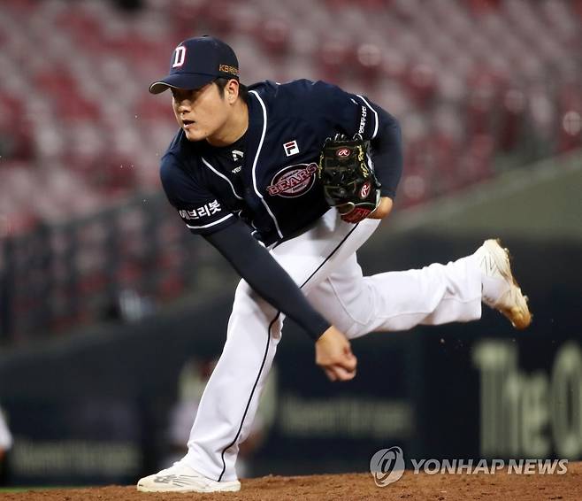 (광주=연합뉴스) 조남수 기자 = 23일 광주-기아챔피언스필드에서 열린 2021 프로야구 두산 베어스와 KIA 타이거즈의 경기에서 두산 김강률이 9회말에 투구하고 있다. 2021.9.23