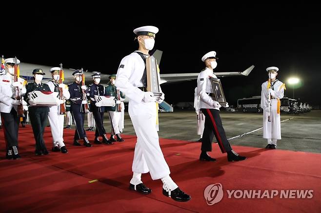 (성남=연합뉴스) 최재구 기자 = 23일 밤 서울공항에서 열린 국군 전사자 유해 봉환식에서 함께 문재인 대통령과 함께 귀국한 국군 전사자 유해가 하기되고 있다. 2021.9.23