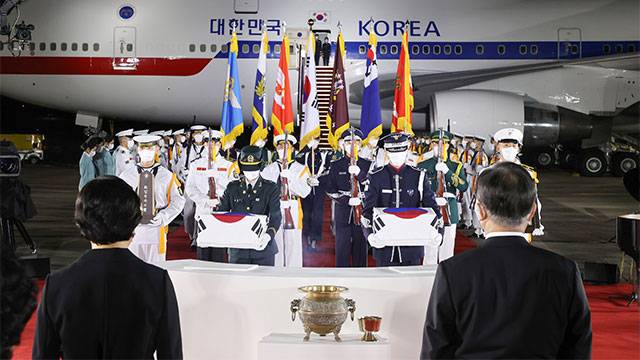 유해는 공군 1호기 앞쪽 좌석에 실려 10시간 가량 비행한 끝에 대한민국 영공으로 돌아왔습니다.
