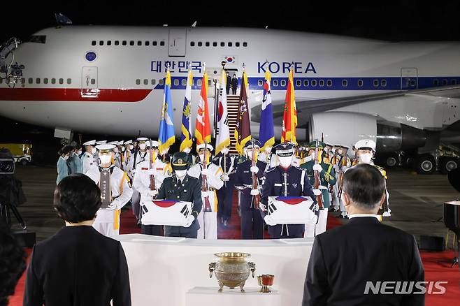 [성남=뉴시스] 김진아 기자 = 방미 일정을 마치고 귀국한 문재인 대통령과 김정숙 여사가 23일 밤 서울공항에서 열린 국군 전사자 유해 봉환식에서 의장병이 국군 전사자 유해를 운구하는 모습을 지켜보고 있다. 2021.09.23. bluesoda@newsis.com