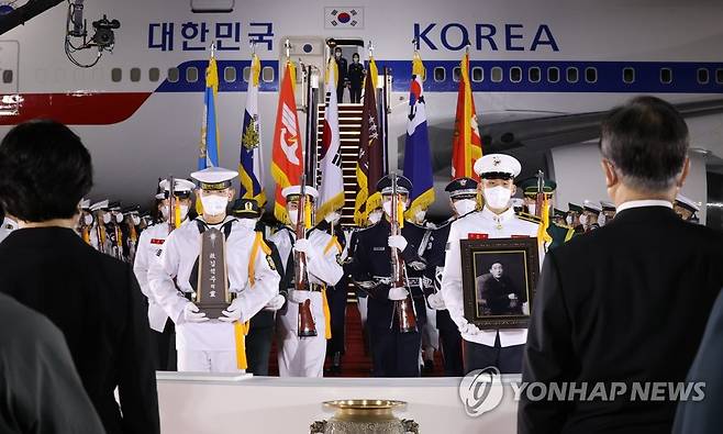 (성남=연합뉴스) 최재구 기자 = 방미 일정을 마치고 귀국한 문재인 대통령과 김정숙 여사가 23일 밤 서울공항에서 열린 국군 전사자 유해 봉환식에서 함께 귀국한 국군 전사자 유해 하기를 지켜보고 있다. 2021.9.23