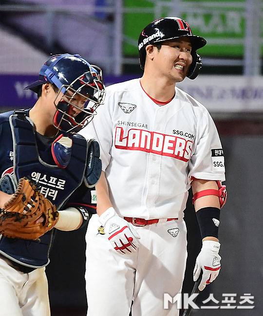 8회말 1사 1, 2루에서 SSG 최정이 루킹 삼진을 당한 후 아쉬워 하고 있다.