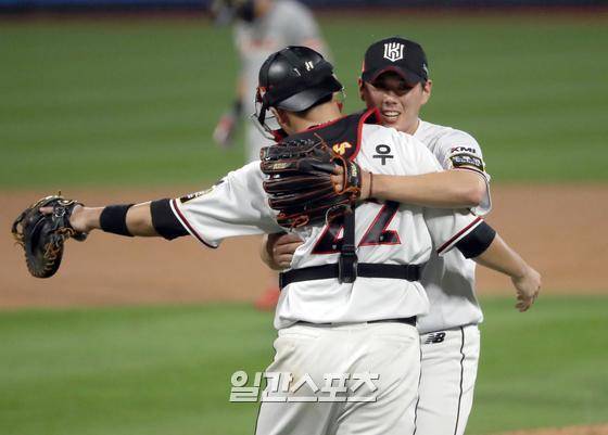 프로야구 KBO리그 한화 이글스와 KT 위즈의 경기가 23일 오후 수원 kt위즈파크에서 열렸다. KT가 3-1로 승리했다. KT마무리 김재윤이 세이브를 한뒤 포수 장성우와 기뻐 하고있다. KBO리그 역대 17번째 100세이브.