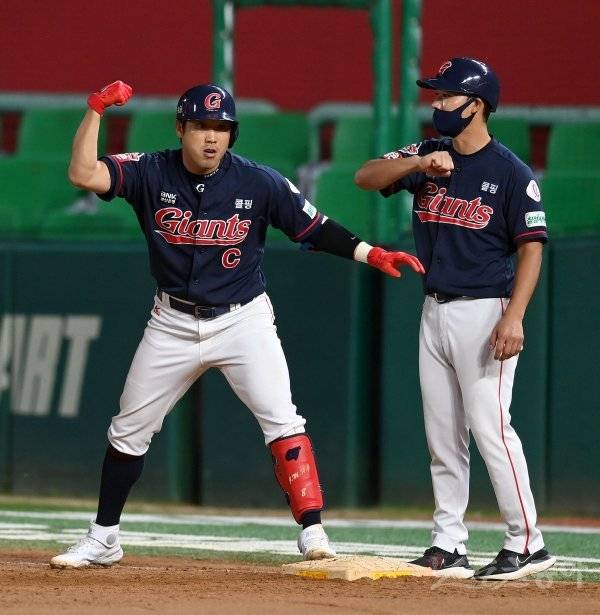 7회초 2사 1,2루 롯데 전준우가 동점타를 친 후 1루에서 기뻐하고 있다.