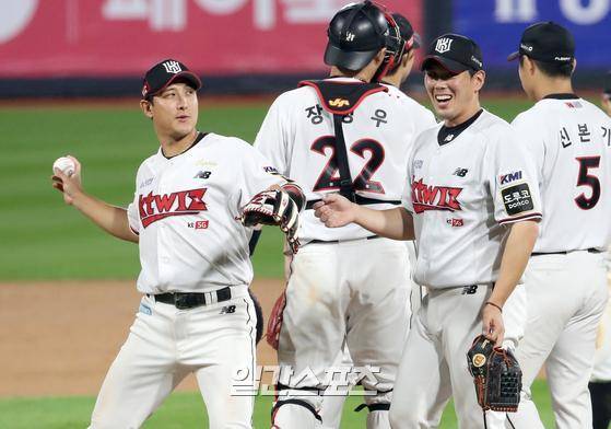 프로야구 KBO리그 한화 이글스와 KT 위즈의 경기가 23일 오후 수원 kt위즈파크에서 열렸다. KT가 3-1로 승리했다. KT마무리 김재윤이 세이브를 한뒤 황재균으로부터 세이브공을 받고있다. KBO리그 역대 17번째 100세이브.
