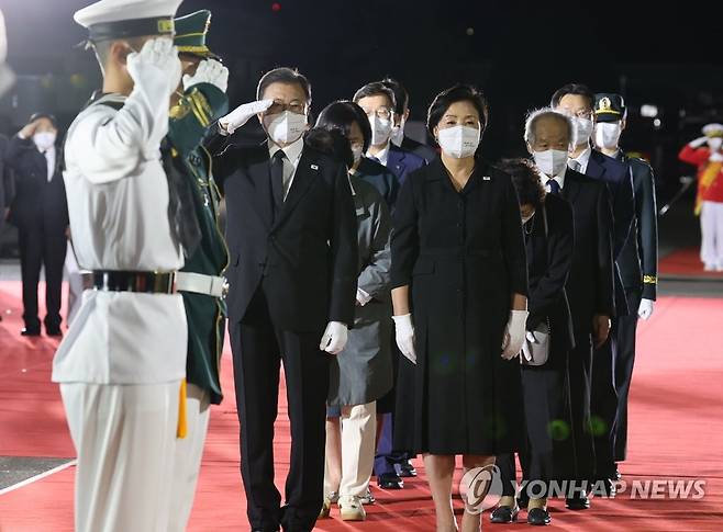 (성남=연합뉴스) 최재구 기자 = 방미 일정을 마치고 귀국한 문재인 대통령과 김정숙 여사가 23일 밤 서울공항에서 열린 국군 전사자 유해 봉환식에서 함께 귀국한 국군 전사자 유해에 경례하고 있다. 2021.9.23