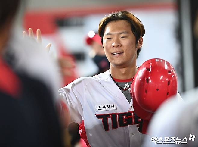 (엑스포츠뉴스 광주, 김한준 기자) 23일 오후 광주-기아 챔피언스필드에서 열린 '2021 신한은행 SOL KBO리그' 두산 베어스와 KIA 타이거즈의 경기, 9회말 1사 1,3루 KIA 김규성이 김태진의 1타점 적시타때 득점에 성공한 후 더그아웃에서 하이파이브를 하고 있다.
