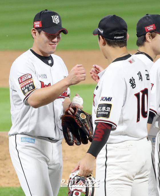 프로야구 KBO리그 한화 이글스와 KT 위즈의 경기가 23일 오후 수원 kt위즈파크에서 열렸다. KT가 3-1로 승리했다. KT마무리 김재윤이 세이브를 한뒤 황재균의 축하를 받고있다. KBO리그 역대 17번째 100세이브.