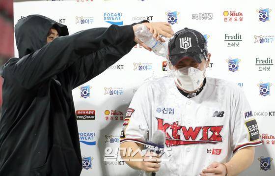 프로야구 KBO리그 한화 이글스와 KT 위즈의 경기가 23일 오후 수원 kt위즈파크에서 열렸다. KT가 3-1로 승리했다. KT마무리 김재윤이 세이브를 한뒤 방송사 인터뷰중 물세례를 받고있다. KBO리그 역대 17번째 100세이브.
