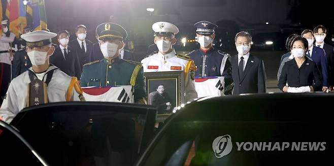 (성남=연합뉴스) 최재구 기자 = 방미 일정을 마치고 귀국한 문재인 대통령과 김정숙 여사가 23일 밤 서울공항에서 열린 국군 전사자 유해 봉환식을 마치고 국군 전사자 유해의 운구를 지켜보고 있다. 2021.9.23