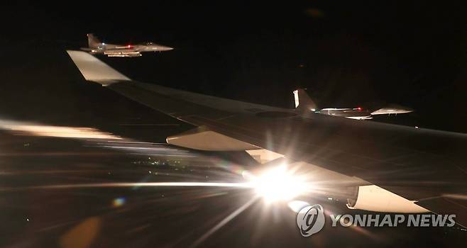 (서울=연합뉴스) 최재구 기자 = 문재인 대통령이 국군유해와 함께 탑승한 공군1호기가 23일 대한민국 한국방공식별구역(KADIZ)으로 들어서자 공군 F-15K 전투기가 호위 비행하며 플레어를 발사하고 있다. 2021.9.23