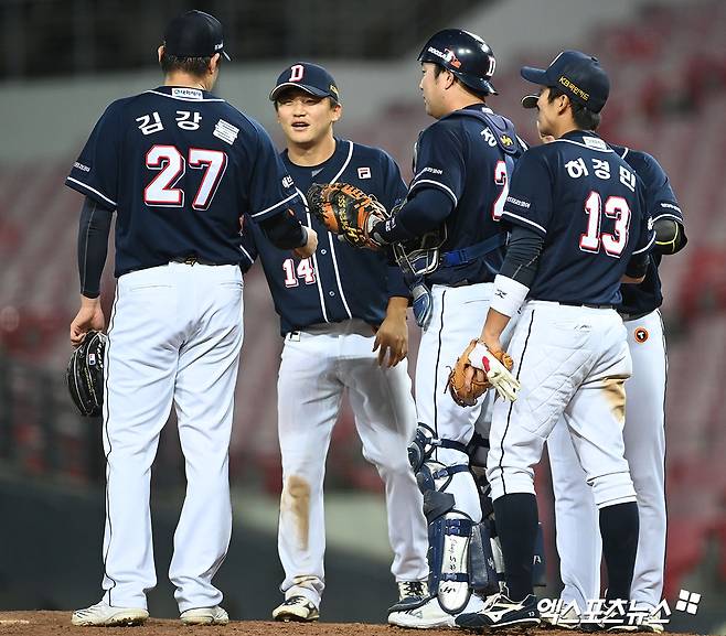 이날 경기에서 승리한 두산 선수들이 기뻐하고 있다.