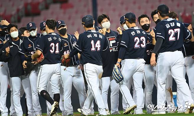 이날 경기에서 승리한 두산 선수들이 기뻐하고 있다.
