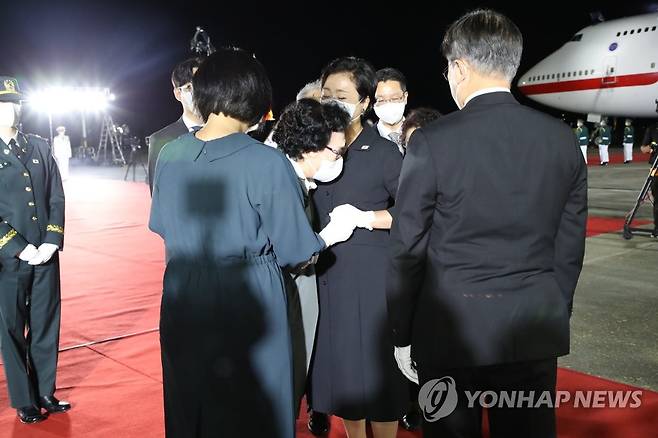 (성남=연합뉴스) 최재구 기자 = 방미 일정을 마치고 귀국한 문재인 대통령과 김정숙 여사가 23일 밤 서울공항에서 열린 국군 전사자 유해 봉환식을 마치고 국군 전사자 유족을 위로하고 있다. 2021.9.23
