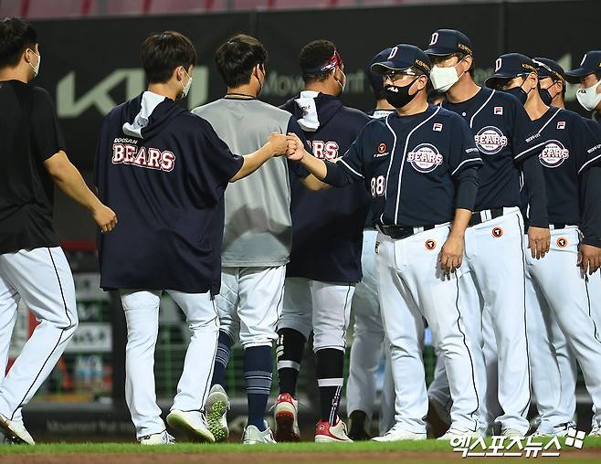 이날 경기에서 승리한 두산 김태형 감독이 선수들과 함께 기뻐하고 있다.