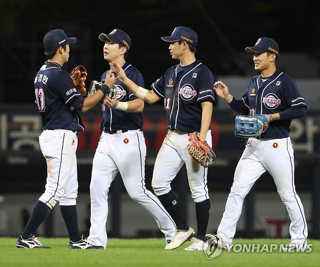 (광주=연합뉴스) 조남수 기자 = 23일 광주-기아챔피언스필드에서 열린 2021 프로야구 두산 베어스와 KIA 타이거즈의 경기에서 3-1로 승리한 두산 선수들이 기뻐하고 있다. 2021.9.23