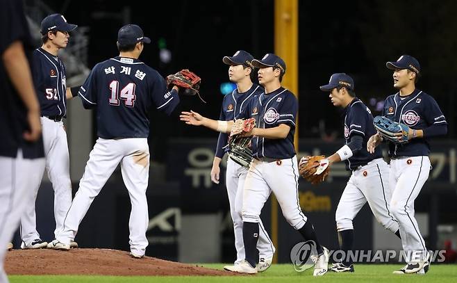 (광주=연합뉴스) 조남수 기자 = 23일 광주-기아챔피언스필드에서 열린 2021 프로야구 두산 베어스와 KIA 타이거즈의 경기에서 3-1로 승리한 두산 선수들이 기뻐하고 있다. 2021.9.23