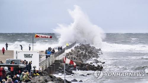 epa09483223 Kite Surfers participate in the Big Air, the kitesurfing Champions League competition, in the North Sea near Vorupoer, in North West Jutland, Denmark, 23 September 2021. EPA/Henning Bagger DENMARK OUT