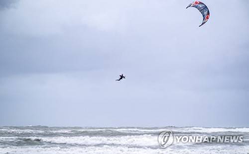 epa09483224 Kite Surfers participate in the Big Air, the kitesurfing Champions League competition, in the North Sea near Vorupoer, in North West Jutland, Denmark, 23 September 2021. EPA/Henning Bagger DENMARK OUT