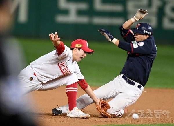 9회초 무사 1루 롯데 보내기번트 때 1루주자 최민재가 2루에서 세이프 되고 있다.