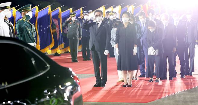 [성남=뉴시스] 김진아 기자 = 방미 일정을 마치고 귀국한 문재인 대통령이 23일 밤 서울공항에서 열린 국군 전사자 유해 봉환식을 마치고 운구되는 국군 전사자 유해를 향해 경례를 하고 있다. 2021.09.23. bluesoda@newsis.com
