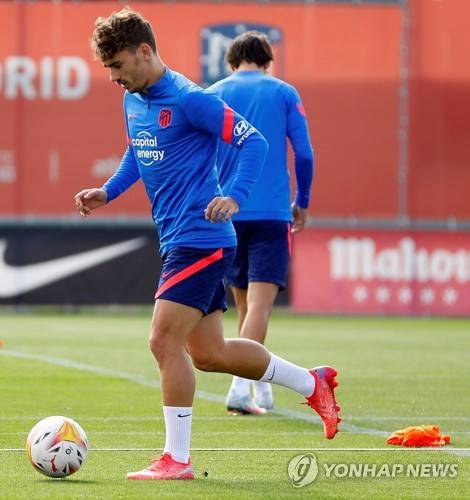 epa09483228 A handout picture provided by Atletico Madrid shows French striker Antoine Griezmann during a training session at Wanda sports city in Majadahonda, Madrid, Spain, 23 September 2021. Atletico Madrid will face Alaves upcoming 25 September in their LaLiga match. EPA/atleticodemadrid.com HANDOUT ONLY AVAILABLE TO ILLUSTRATE THE ACCOMPANYING NEWS (MANDATORY CREDIT) HANDOUT EDITORIAL USE ONLY/NO SALES
