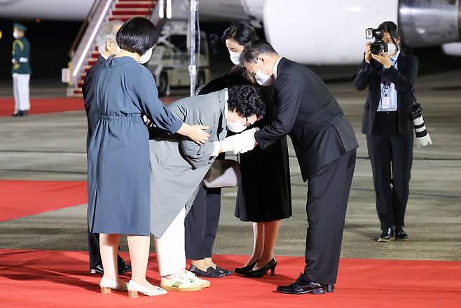 [성남=뉴시스] 김진아 기자 = 방미 일정을 마치고 귀국한 문재인 대통령과 김정숙 여사가 23일 밤 서울공항에서 열린 국군 전사자 유해 봉환식에서 유족을 위로하고 있다. 2021.09.23. bluesoda@newsis.com