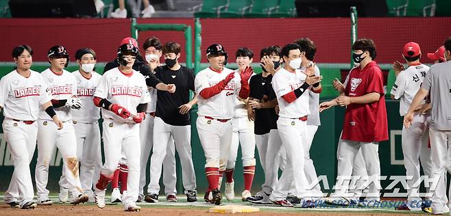 23일 인천 SSG랜더스필드에서 KBO리그 SSG와 롯데의 경기가 열렸다. 9회말 2사 2루에서 SSG 이재원이 끝내기안타를 날렸다. 동료들의 축하를 받고 있는 이재원. 인천=송정헌 기자 songs@sportschosun.com/2021.09.23/