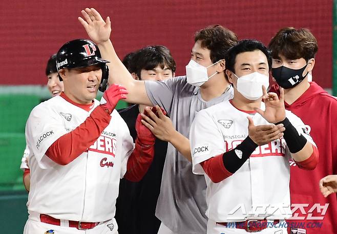 23일 인천 SSG랜더스필드에서 KBO리그 SSG와 롯데의 경기가 열렸다. 9회말 2사 2루에서 SSG 이재원이 끝내기안타를 날렸다. 동료들의 축하를 받고 있는 이재원. 인천=송정헌 기자 songs@sportschosun.com/2021.09.23/