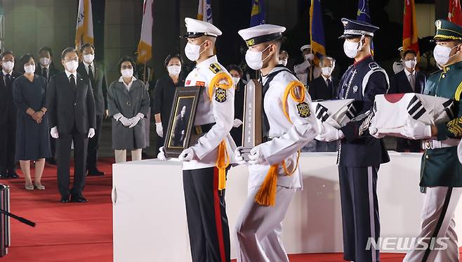 [성남=뉴시스] 김진아 기자 = 방미 일정을 마치고 귀국한 문재인 대통령과 김정숙 여사가 23일 밤 서울공항에서 열린 국군 전사자 유해 봉환식에서 국군 전사자 유해를 바라보고 있다. 2021.09.23. bluesoda@newsis.com