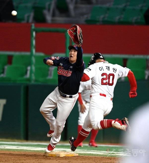 9회말 2사 3루 SSG 이재원이 끝내기 안타를 치고 1루에서 세이프 되고 있다.