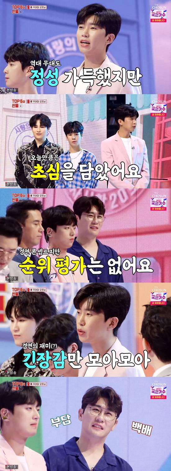 이날 특집 무대는 '미스터 트롯'과 비슷하게 꾸며졌다. 심사석에 앉은 장민호는 떨리는 마음을 드러내며 "무대와 심사석의 자리가 보기보다 가깝다. 여기에 있으나 저기에 있으나 떨린다"고 말했다. 김성주는 "혹독한 심사를 할 수 있는 기회도 드리겠다"고 덧붙였다.