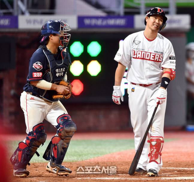 SSG 4번 최주환이 23일 2021프로야구 SSG랜더스와 롯데자이언트의 경기 8회말 1사 1,2루에서 삼진으로 물러나며 아쉬워하고 있다. 2021.09.23.