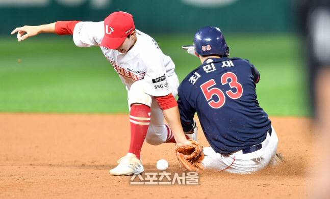 SSG 유격수 박성한이 23일 2021프로야구 SSG랜더스와 롯데자이언트의 경기 9회초 무사 1루 9번 마차도 투수앞 땅볼대 볼을 놓치며 1루주자 최민재를 살려주고 있다. 2021.09.23.