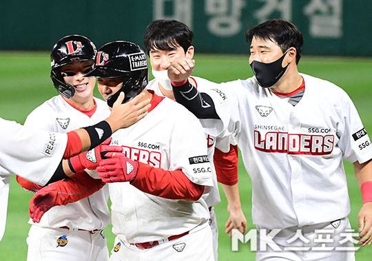 9회말 2사 3루에서 SSG 이재원이 승리를 확정짓는 끝내기 안타를 치고 동료들과 기뻐하고 있다.