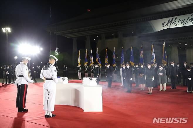 [성남=뉴시스] 김진아 기자 = 방미 일정을 마치고 귀국한 문재인 대통령과 김정숙 여사 등 참석자들이 23일 밤 서울공항에서 열린 국군 전사자 유해 봉환식에서 국군 전사자들을 추모하고 있다. 2021.09.23. bluesoda@newsis.com