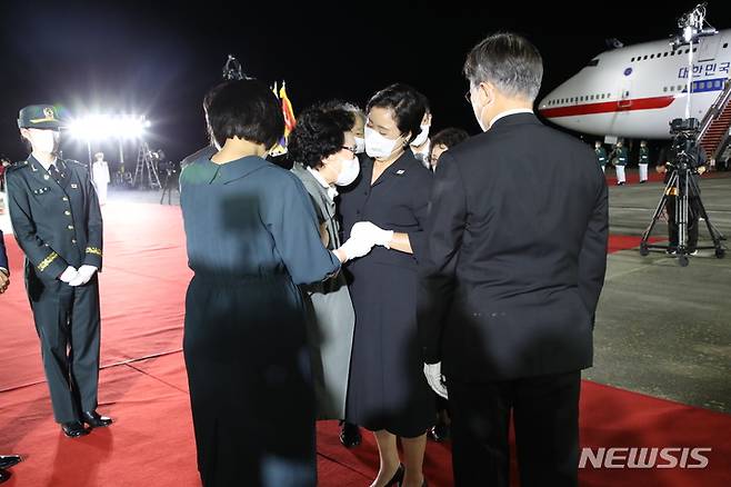[성남=뉴시스] 김진아 기자 = 방미 일정을 마치고 귀국한 문재인 대통령과 김정숙 여사가 23일 밤 서울공항에서 열린 국군 전사자 유해 봉환식에서 국군 전사자 유족들을 위로하고 있다. 2021.09.23. bluesoda@newsis.com