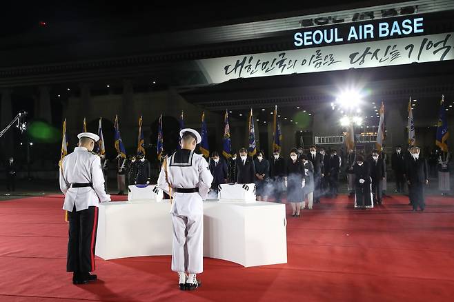 봉환식에는 문 대통령 부부 외에도 서욱 국방부 장관, 황기철 국가보훈처장, 유영민 대통령 비서실장, 서훈 국가안보실장 및 육·해·공군 참모총장을 비롯한 군 관계자 등 20여명이 참석했습니다.