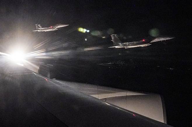 [성남=뉴시스] 김진아 기자 = 문재인 대통령이 국군유해와 함께 탑승한 공군1호기가 23일 대한민국 한국방공식별구역(KADIZ)으로 들어서자 공군 F-15K 전투기가 호위 비행하고 있다. 2021.09.23. bluesoda@newsis.com