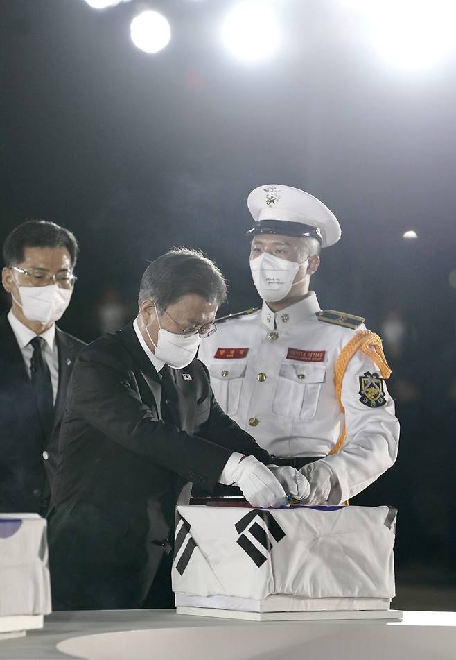 [성남=뉴시스] 김진아 기자 = 방미 일정을 마치고 귀국한 문재인 대통령이23일 밤 서울공항에서 열린 국군 전사자 유해 봉환식에서 국군 전사자에게 참전기장을 수여하고 있다. 2021.09.23. bluesoda@newsis.com