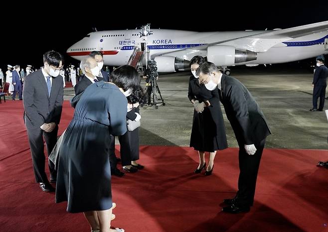 [성남=뉴시스] 김진아 기자 = 방미 일정을 마치고 귀국한 문재인 대통령과 김정숙 여사가 23일 밤 서울공항에서 열린 국군 전사자 유해 봉환식에서 유족과 인사하고 있다. 2021.09.23. bluesoda@newsis.com