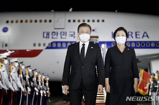 [성남=뉴시스] 김진아 기자 = 방미 일정을 마치고 귀국한 문재인 대통령과 김정숙 여사가 23일 밤 서울공항에서 열린 국군 전사자 유해 봉환식에 참석하고 있다. 2021.09.23. bluesoda@newsis.com
