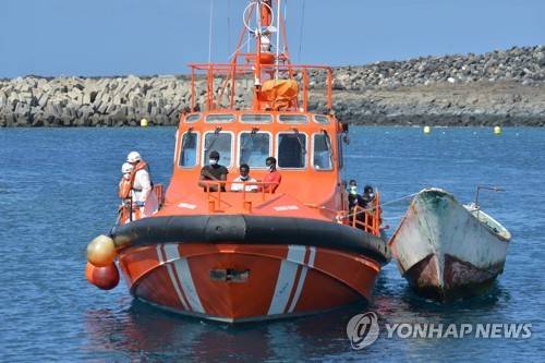 epa09483315 Migrants are seen on a Sea Rescue boat after being rescued while traveling in a small boat, in La Restinga, El Hierro island, Canary Island, Spain, 23 September 2021. A group of 39 Sub Saharan migrants arrived by their own means to El Hierro while another 70 were rescued by Sea Rescue workers while they were 13 kilometers away from the coast. EPA/Gelmert Finol