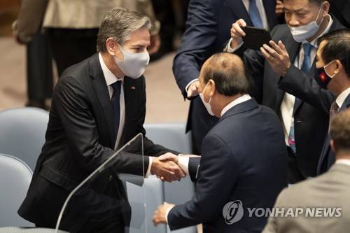 epa09483318 United States Secretary of State Antony Blinken (L) shakes hands with president of Vietnam Nguyen Xuan Phuc (R) before the United Nations Security Council meeting during the 76th Session of the U.N. General Assembly in New York City, New York, USA, 23 September 2021. EPA/JOHN MINCHILLO / POOL