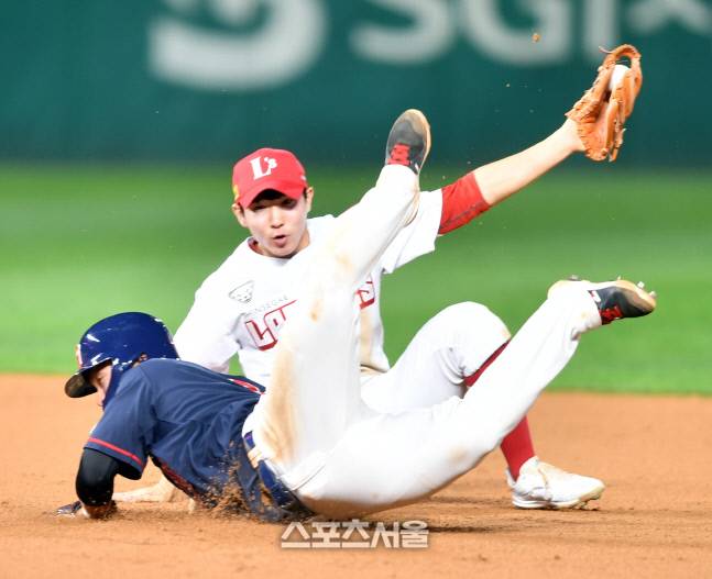 롯데 8번 안중열이 23일 2021프로야구 SSG랜더스와 롯데자이언트의 경기 7회초 1사 1루 9번 마차도의 중견수앞 떨어지는 안타때 2루에서 포스아웃되고 있다. 2루 수비는 박성한. 2021.09.23.