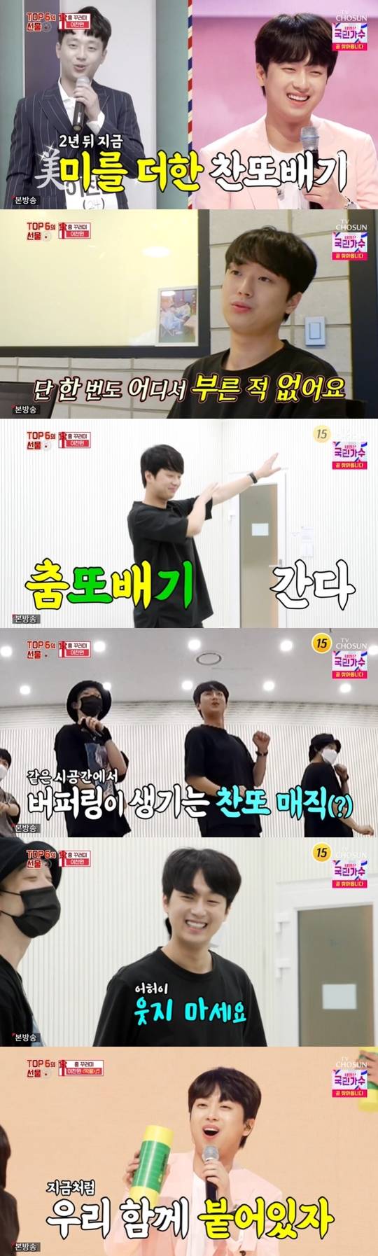 이찬원은 "영탁이 형이 처음에 얘기했을 때 몰랐는데 마스터 석에 앉아 있는 여섯 분을 보니까 느낌이 새롭다. 무대 안 하신 분들은 내려와서 보시면 느끼게 될 것"이라고 급히 긴장했다.
